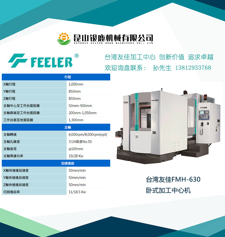 臺灣友嘉FMH-630雙臺面臥式加工中心,設計理念在高效率、穩定、重切削之具體表現??梢猿薪幽>?、大型工件加工。針對一般精密工件或是模具加工,都可勝任。穩固高剛性結構,特殊高低軌設計,底座采用T型一體式三層箱形結構設計,配合鑄件內部優化的肋骨強化,發揮機械剛性與穩定性;門型雙重壁之立柱結構,剛性穩固,保證重切削之需;底座采用高低軌設計,有效縮短力流線,并且提高加工穩定性。工作臺配置大錐面托板定位拉栓,定位精密、保證加工精度。配備旋轉式自動交換工作臺,最大荷重1200KG,工作臺最大直徑950mm,最快交換速度10秒。鏈條式刀庫,60、80、90、120刀位備選。