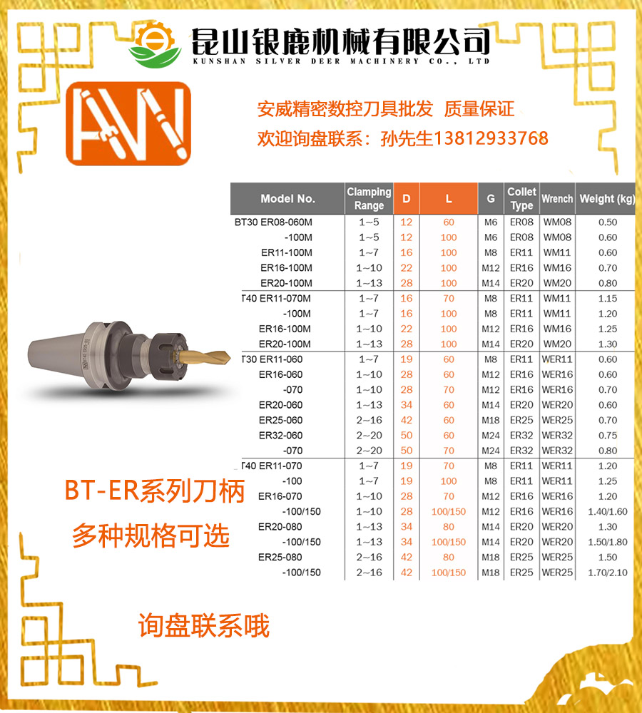 臺灣安威BT30/40-ER25-60/80/100加工中心刀柄優質代理,常規都有現貨供應,品牌產品品質好,價格實惠,給你提供優質服務。感謝垂詢!!!